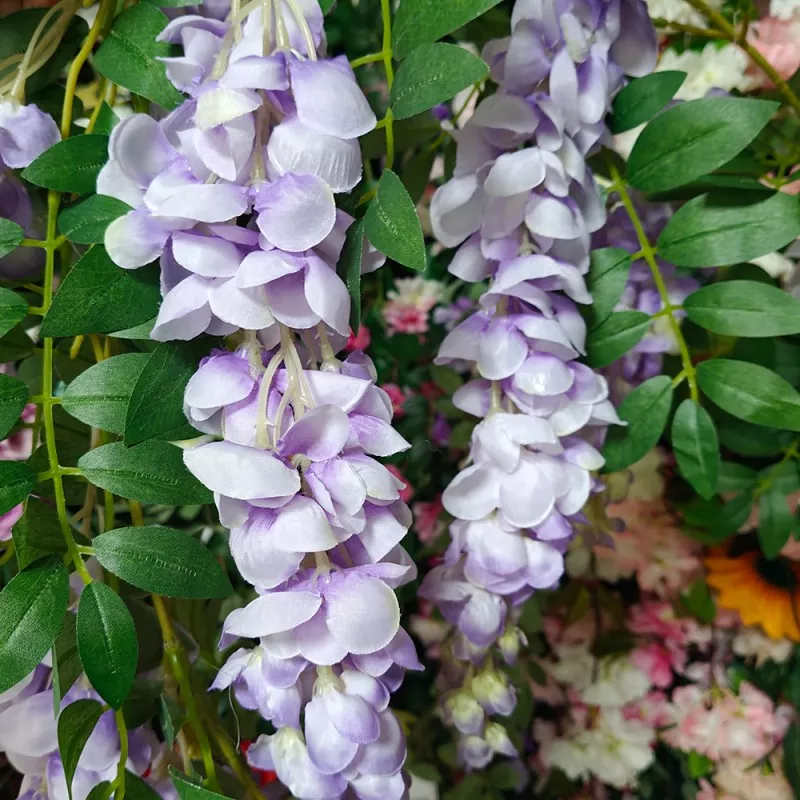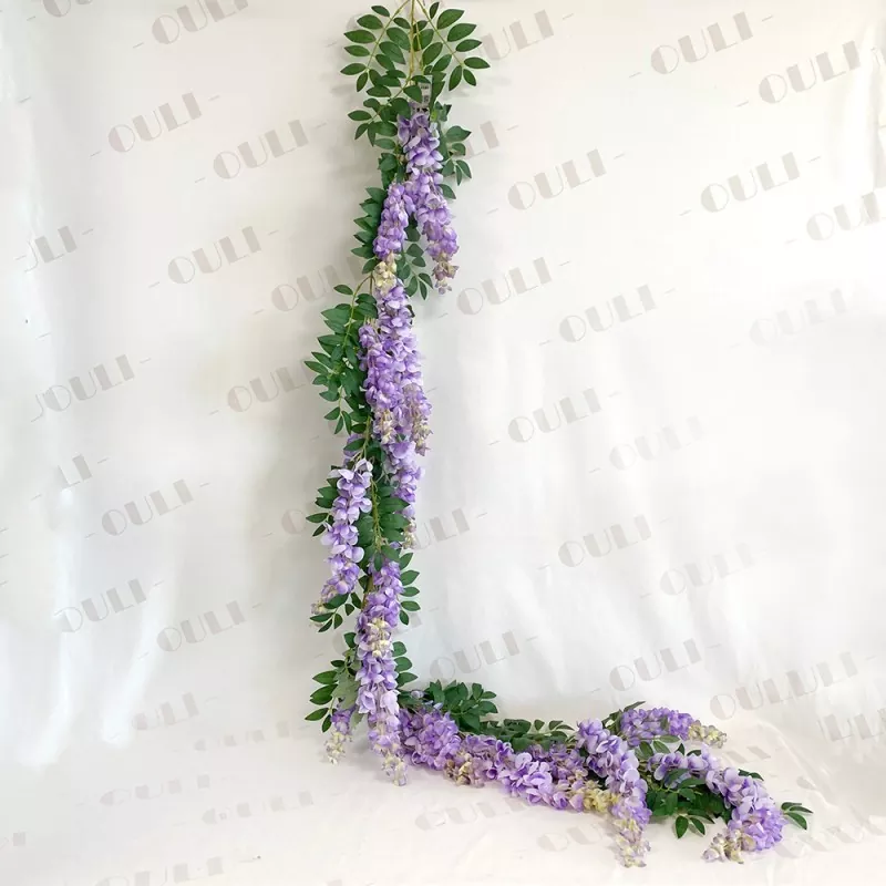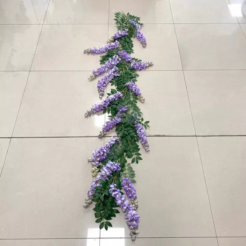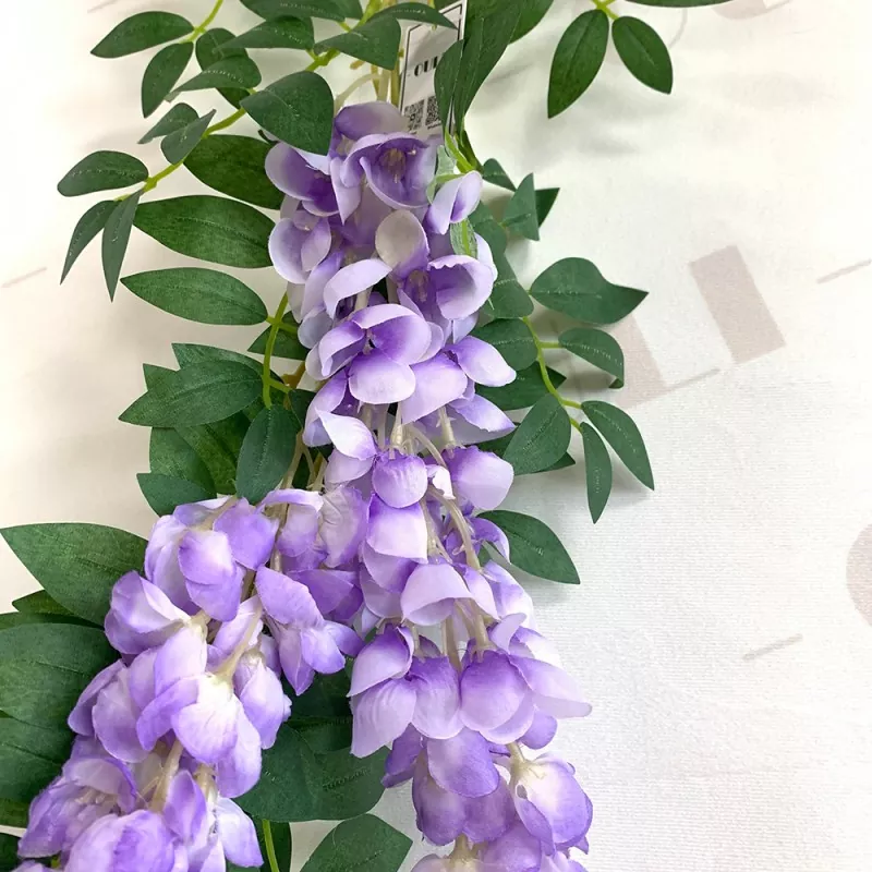Šis 2 metrų ilgio netikras „Wisteria Vine“ yra pagamintas iš aukštos kokybės šilko, plastiko ir geležies vielos. Kiekvienoje šakoje yra 17 „Witeria“ gėlių stygų ir 40–50 žalių lapų. Jis turi natūralų apklotą. Tiek gėlių, tiek lapų tankis yra labai geras. Tai labai tinka vestuvių arkos dekoravimui, kraštovaizdžio luboms, dirbtinių gėlių fono siena ar komercinės erdvės pakabinimo išdėstymui.