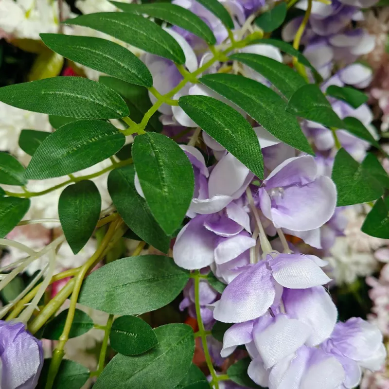 Mūsų kruopščiai suprojektuotas padirbtos „Wisteria Vine“ sienos kabinimas yra turtingas ir gėlių formos spalva. Galite pasirinkti įvairias įprastas spalvas arba pritaikyti išskirtines „Pantone“ spalvas pagal klientų poreikius, tinkančius vestuvėms ir skirtingų stilių scenoms. Struktūra yra stipri ir gali būti pakartotinai naudojama be priežiūros.